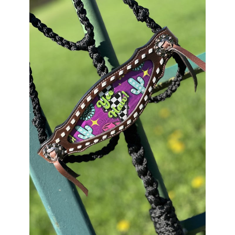 Black braided rope halter with attached lead featuring a leather nose with neon yeehaw! print leather inlay, white buck stitch... Read more