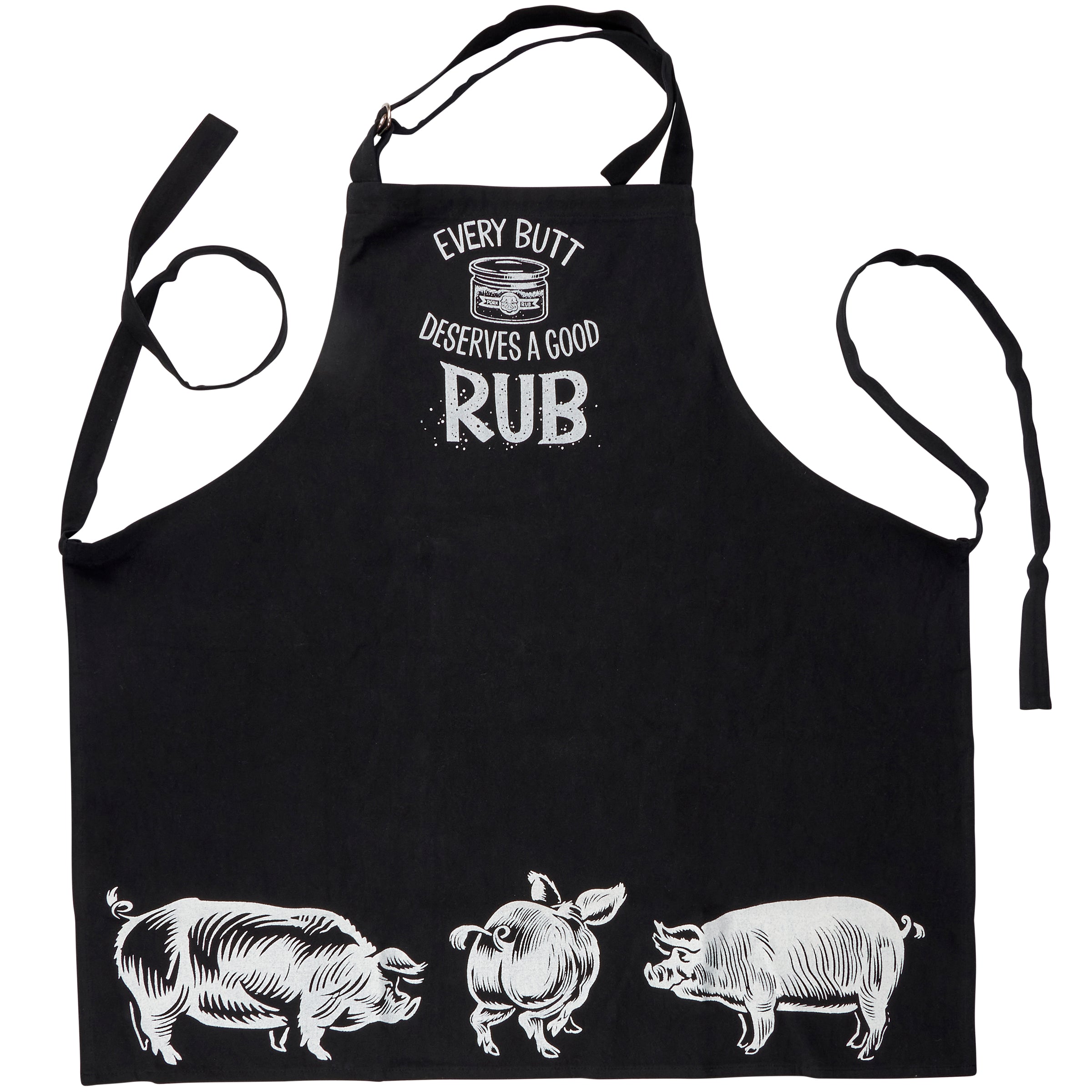 A black cotton apron from our Grilling & Chilling Collection displaying white hand illustrated pig and pork rub designs with fun... Read more