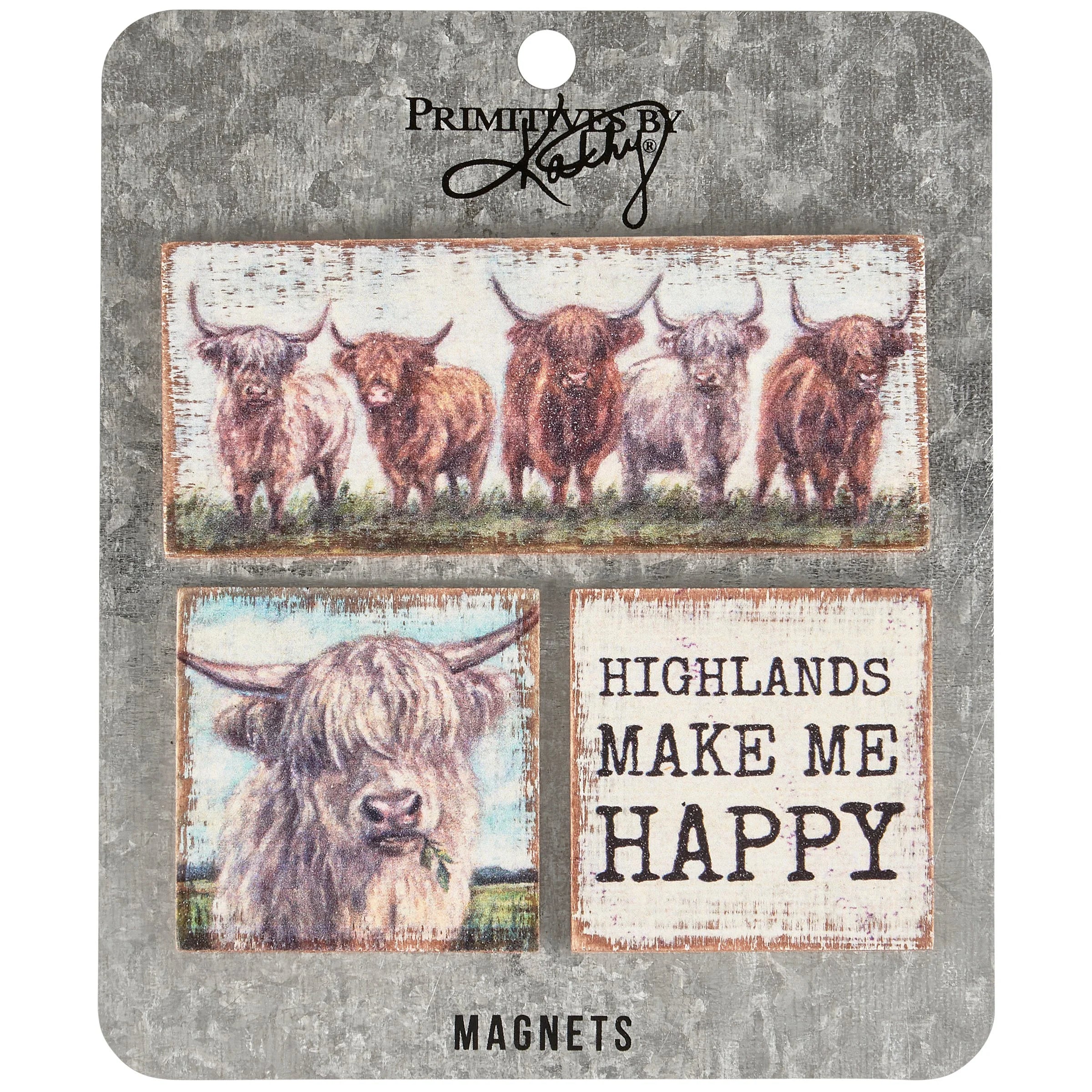 A set of three wooden magnets from our Farmhouse displaying hand painted scenes of highland cows and one with a sentiment that reads "Highlands Make Me Happy." Designs are replicated from original artwork painted onto burlap canvas, giving the art a unique depth and texture. Our Highland Cows magnet set is packaged on a galvanized metal card and in poly bag for easy store display and gifting. A gift set of rustic farm-themed home accents with a variety of display options.
