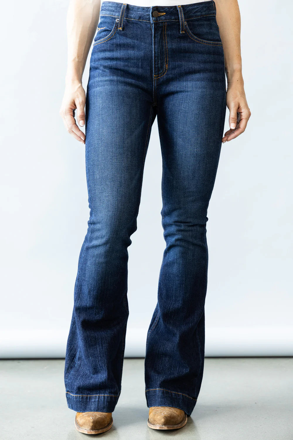 With an ultra-high rise and super wide flare leg, the Jennifer flatters all shapes and sizes. Our bestselling denim in a dark wash with hand-sanding whisker details, the Jennifer makes a statement in the saddle or the city streets.