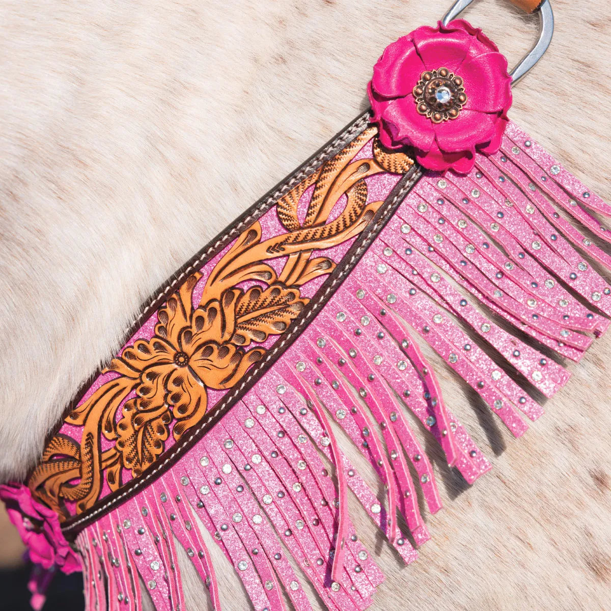 Introducing the Malibu Tack Set - a unique and stylish must-have for any fashionista's wardrobe! Handcrafted with gorgeous floral overlays, pink glitter inlays, and pink glitter fringe with crystals to give your ride an eye-catching sparkle. Our handmade pink leather flowers make this tack set truly one-of-a-kind - perfect for taking your style to a whole new level. No matter where you go, everyone's sure to take notice of your unique and dazzling look. Great for arena competitions, shows, events or simply adding a splash of color to your everyday look. This elegant set is designed with quality and comfort in mind so you can ride in style without compromising performance or fit. Add some luxury to your riding gear today with the Malibu Tack Set!