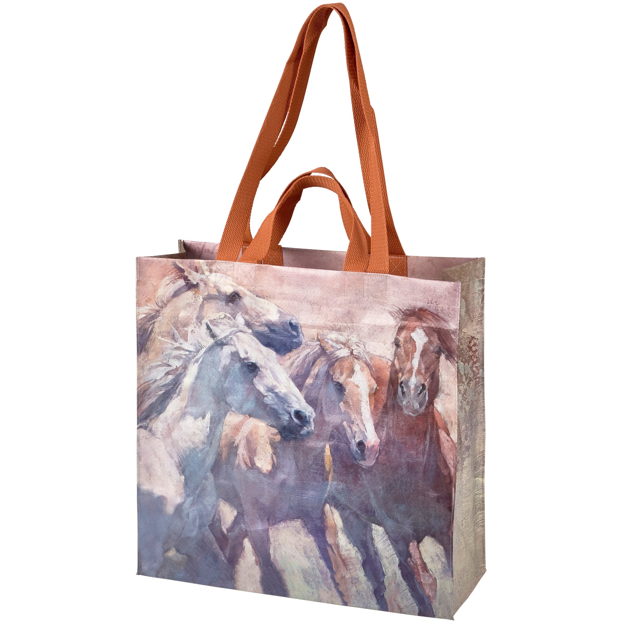 A double-sided market tote displaying a hand painted scene of western horses. Side gussets display coordinating patterns. Designs are replicated from... Read more