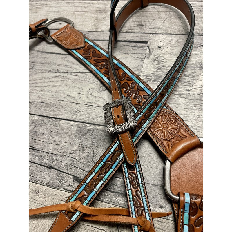 Beautiful medium oil headstall and breast collar set featuring tooled hand painted leopard print, accented with turquoise edge, turquoise stitching,... Read more