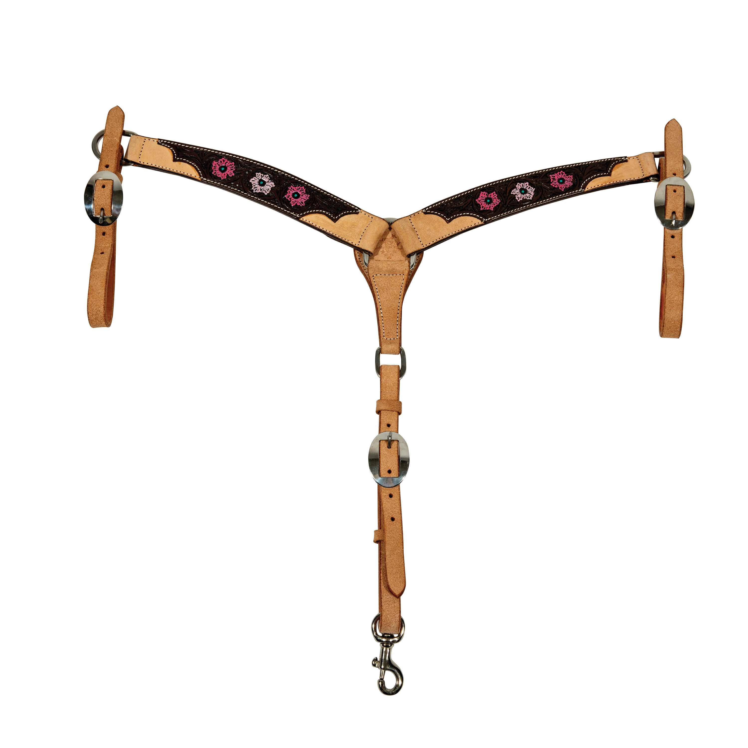 *Pony size contoured breast collar *Chocolate leather overlay with pink painted flowers *Natural roughout accents *Stainless steel hardware Read more