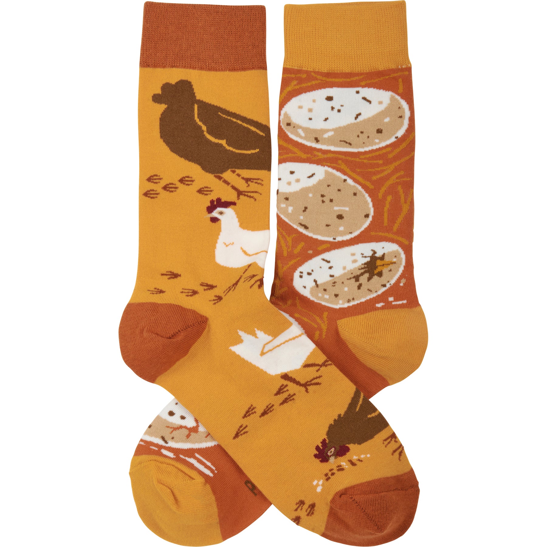 displaying mismatched designs of chickens on one sock and eggs on the other. Socks feature a one size fits most... Read more