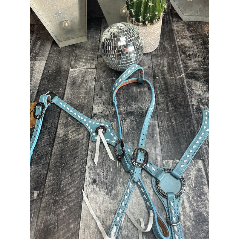 Turquoise leather headstall and breast collar set featuring white buck stitch and silver and black engraved slotted conchos with white ties and buckles. one ear headstall with leather ties.