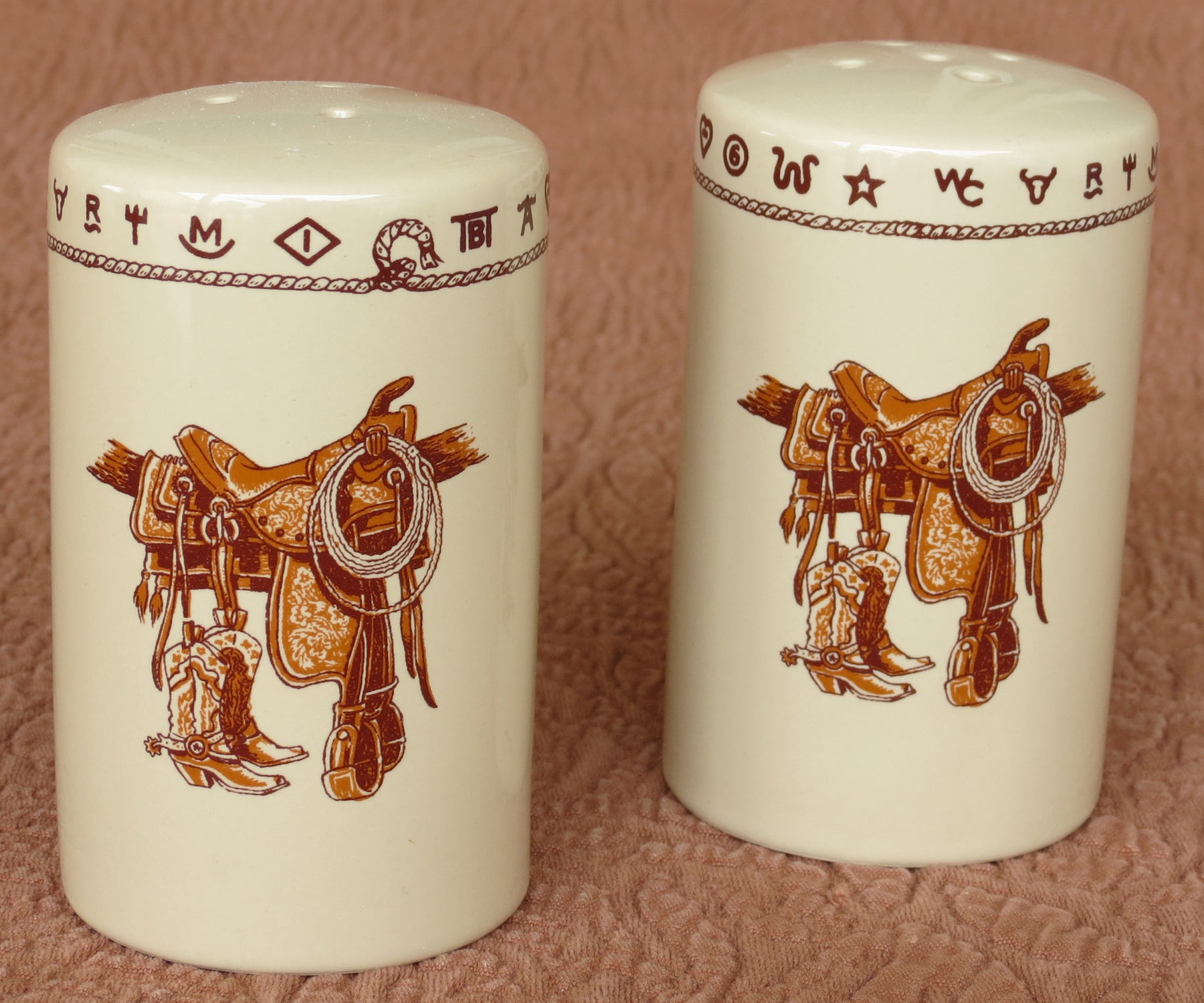 Shaker size: 2.5 diameter x 4 inches tall Beige glaze with dark brown rope & brands with iconic boots &... Read more